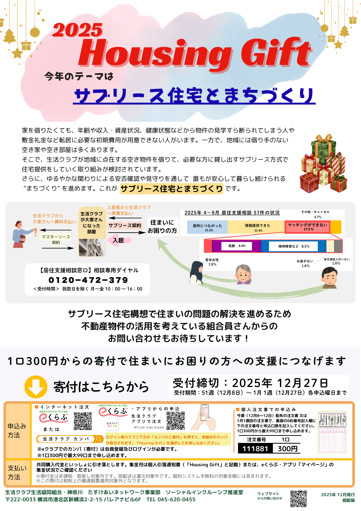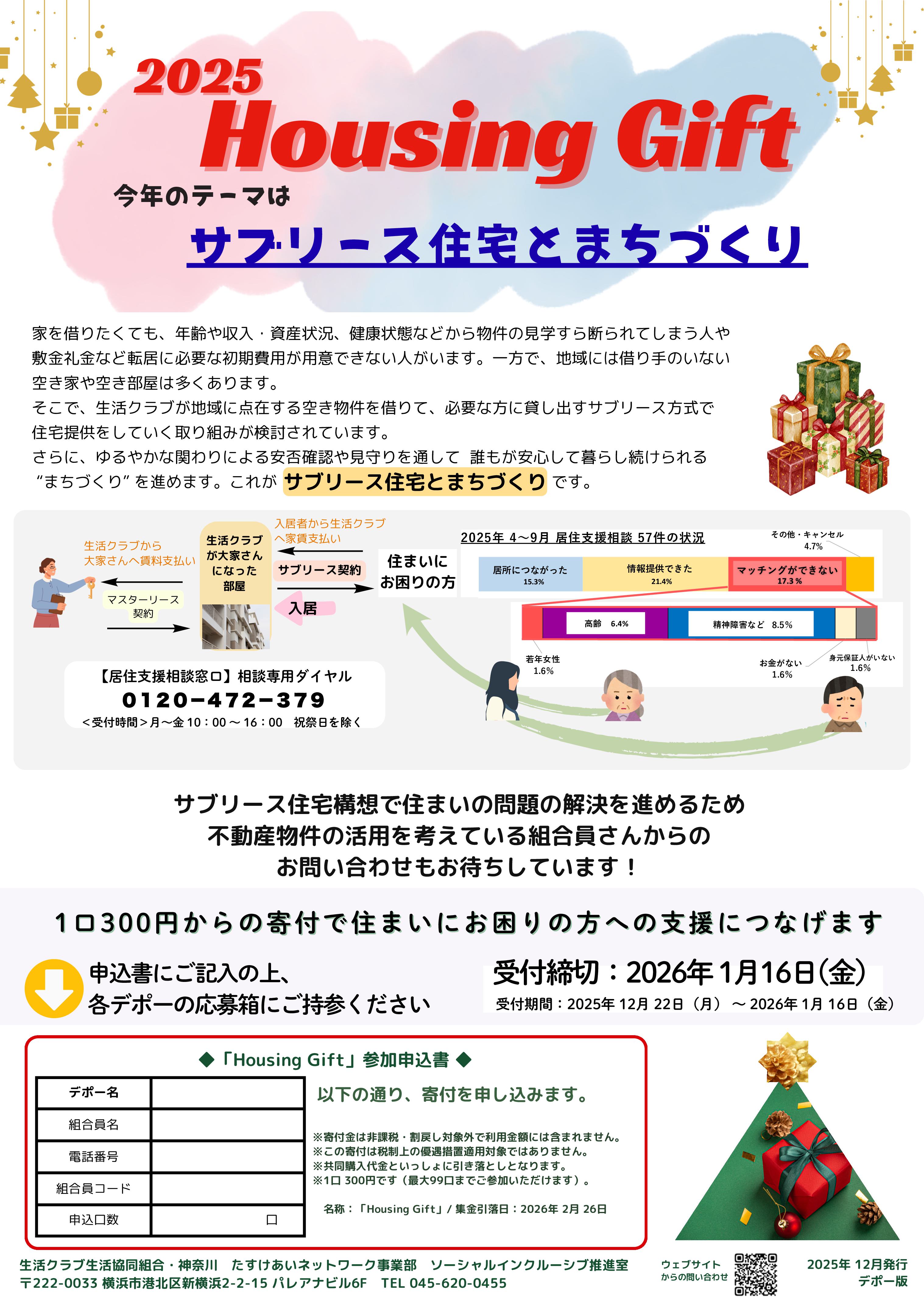 生活クラブ神奈川では、さまざまな状況の中で生活の基盤である住まいを失い、安心して暮らせる場所がない方々のために 「Housing Gift」 という居住支援の寄付募集の取り組みを行っています。