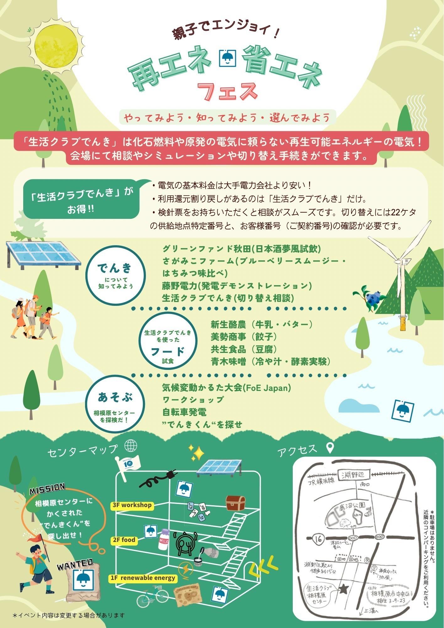 生活クラブ神奈川の5つの地域生協で、地球環境や再生可能エネルギー、省エネについて学べるイベントを開催します。お子様が楽しめる企画もあるのでご家族でご参加ください。