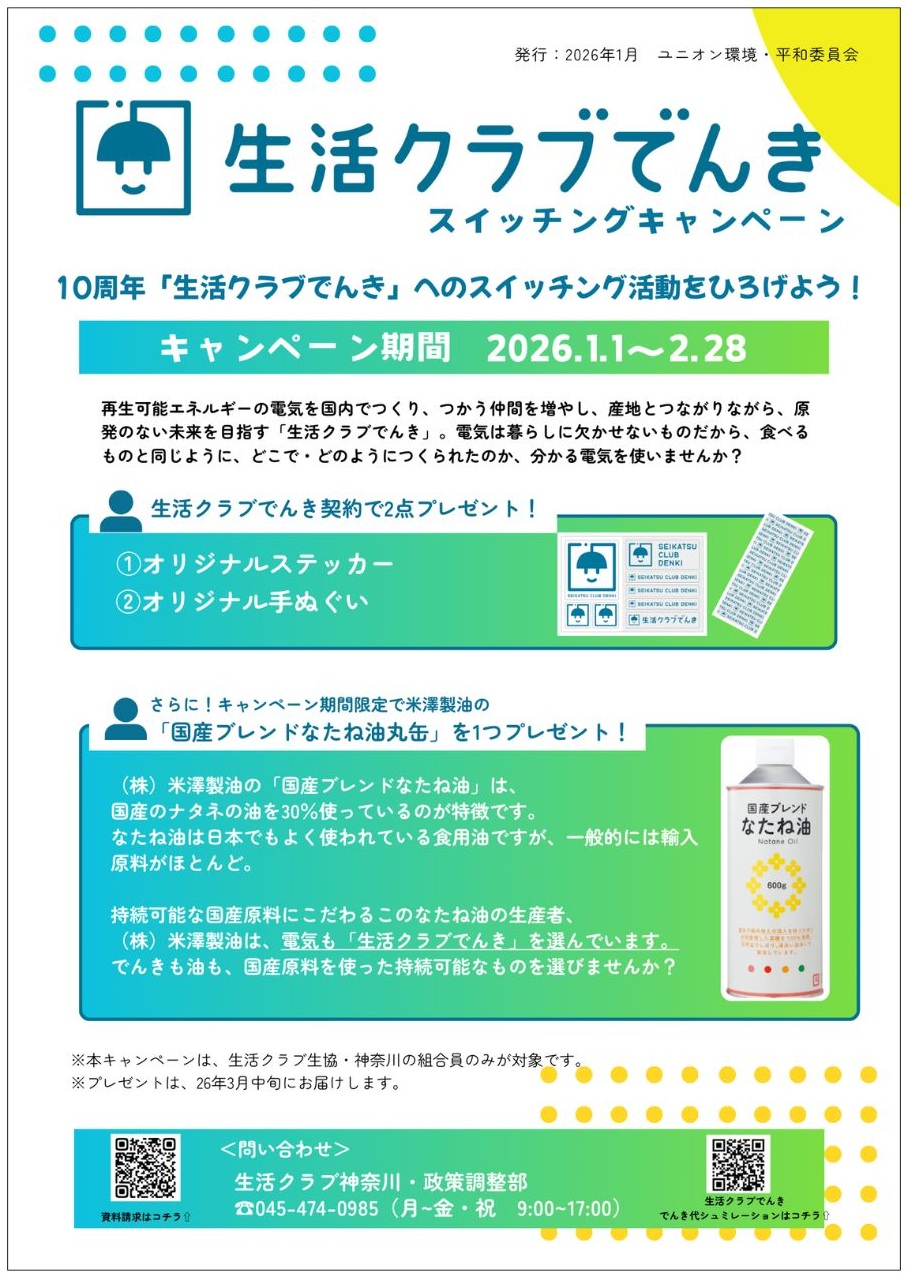 2026年1月1日(木)~2026年2月28日(土)までに「生活クラブでんき」に加入すると、オリジナルグッズと国産ブレンドなたね油丸缶がもらえるキャンペーンを実施中!※生活クラブ神奈川組合員に限ります。