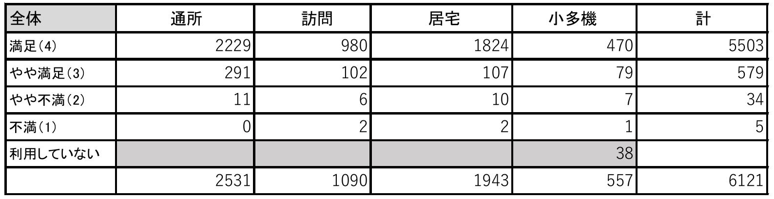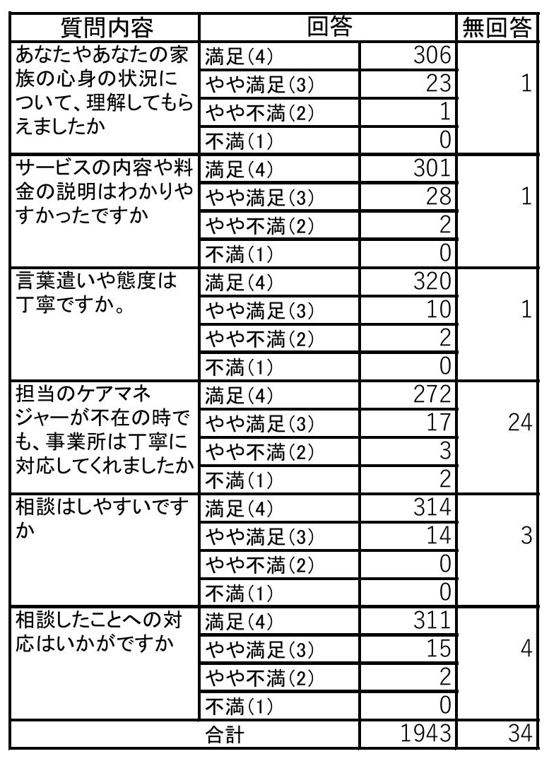 ・「あなたやあなたの家族の要望や心身の状況について理解してもらえたか」「サービス内容や料金説明」「言葉遣いや態度」「担当不在時の事務所の対応」「相談のしやすさ」「相談したことへの対応」について満足度をお聞きしました。