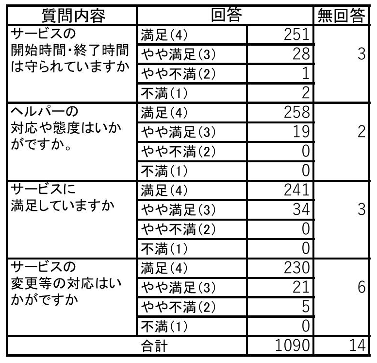 ・「サービスの開始・終了時間」「ヘルパーの対応や態度」「サービス」「サービス変更等の対応」について満足度をお聞きしました。